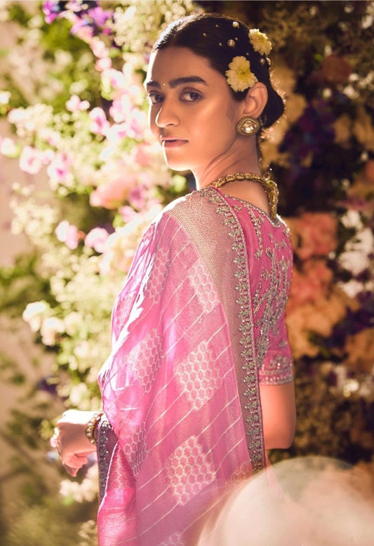 Fabulous Light Pink And Purple Organza Silk With Embroidery Saree