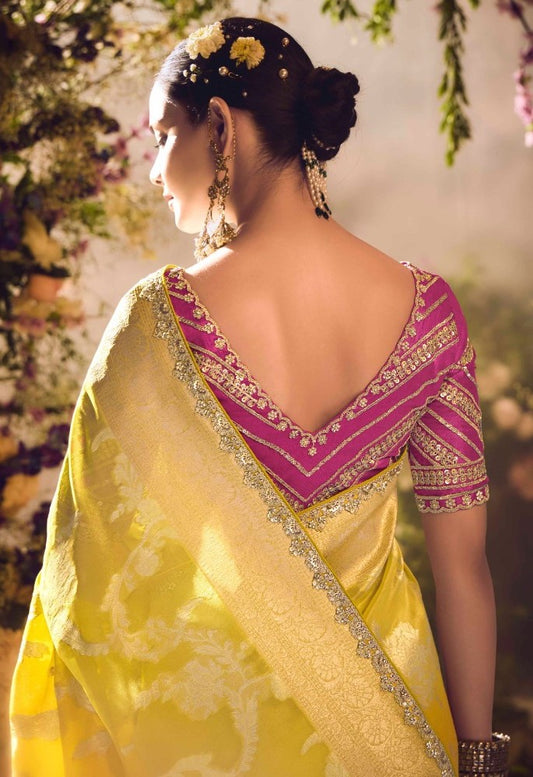 Attractive Yellow And Pink Banarasi Tissue Silk Sarees