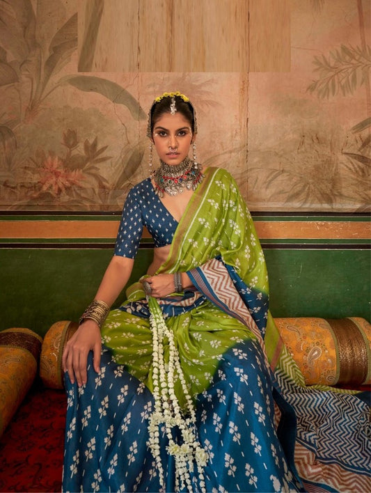 Green And Blue Silk Printed Saree