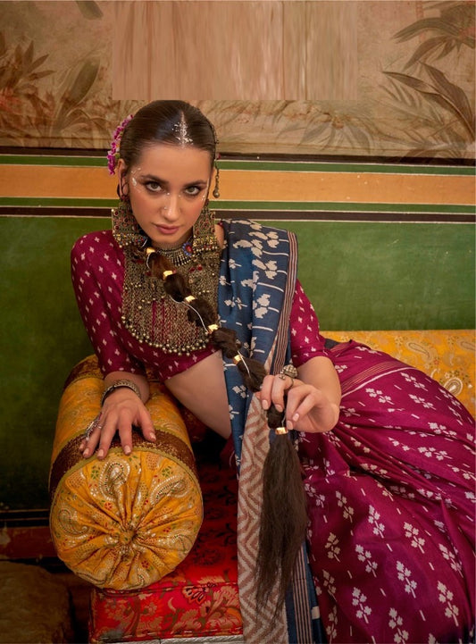 Fashionable Burgundy And Blue Silk Printed Saree