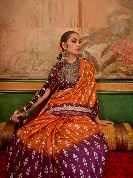Elegant Wine And Rust Silk Printed Saree