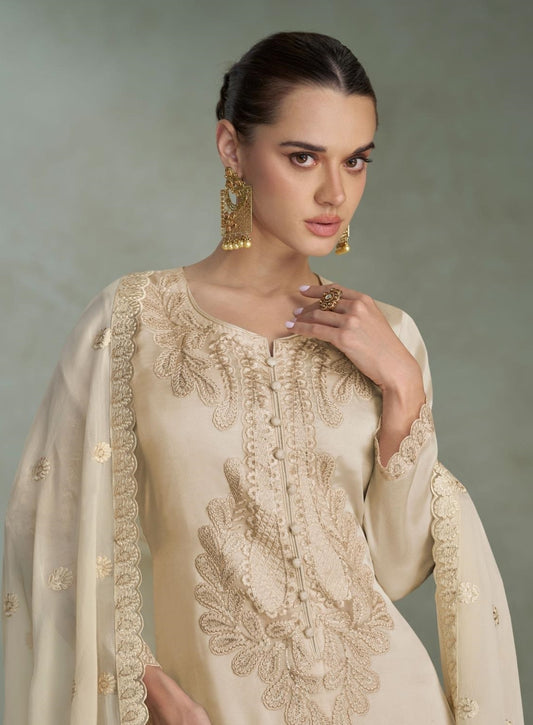 Women Beige Chinon Silk With Embroidery Work Pakistani Suit Set