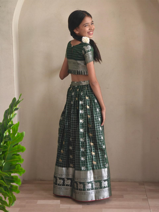 Lovely Bottle Green Soft Silk Kanchipuram Kids Lehenga