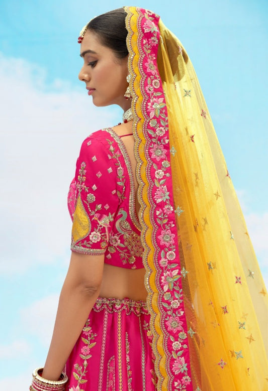 Luxe Yellow And Pink Jacquard Silk Zari With Weaving Work Traditional Lehenga