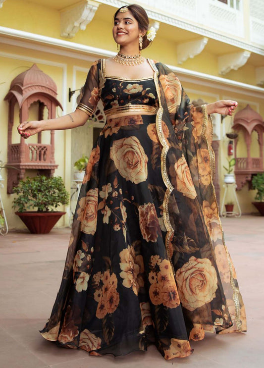 Women Black Organza Stylish Lehenga