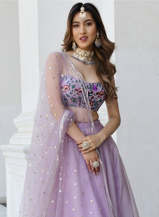 Women Lilac Organza Net Stylish Lehenga