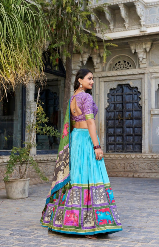 Women Blue Multi Tussar Silk Floral Print Lehenga
