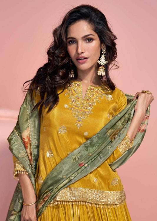 Magnificent Mustard Pure Viscose Jacquard Silk Real Shimmer Organza Silk Gown With Dupatta