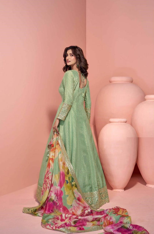 Women Sea Green Pure Viscose Jacquard Silk Real Shimmer Organza Silk Gown With Dupatta