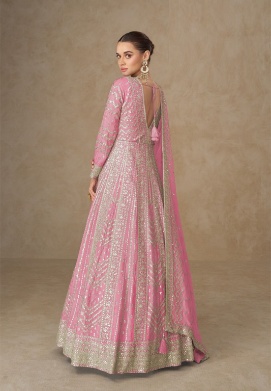 Gleaming Baby Pink Real Chinon Silk Georgeete Gown With Dupatta