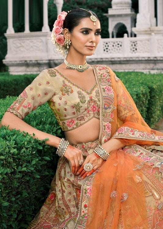 Effortless Orange Fancy Silk Bridal Lehenga