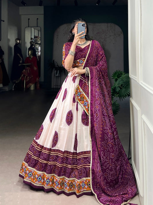 Exquisite White And Purple Tussar Silk Festive Wear Lehenga Set