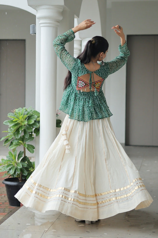 Graceful Off White And Green Cotton With Attractive Gota Patti Lace Work Festive Wear Lehenga Set