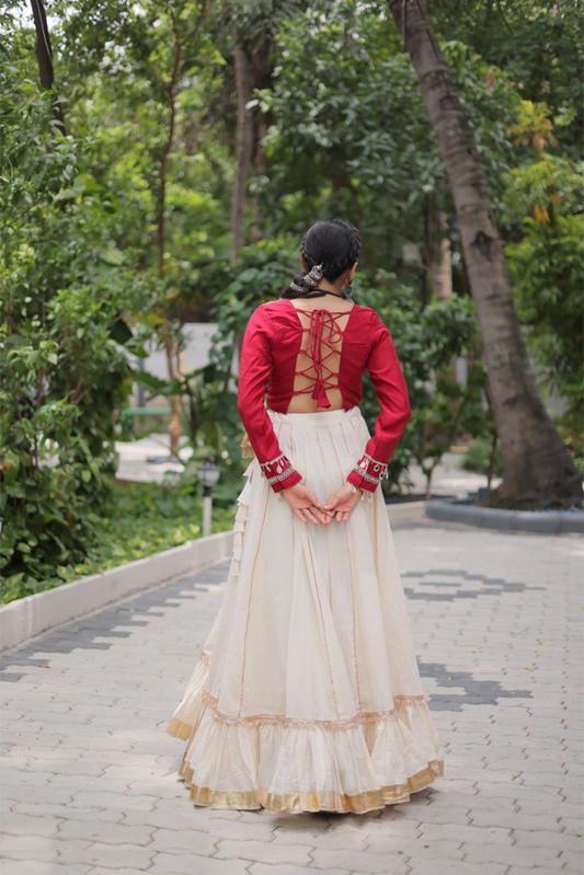 Trendy Off White And Maroon Cotton With Attractive Gota Patti Lace Work Festive Wear Lehenga Set