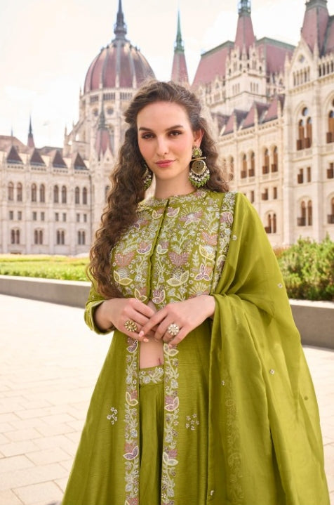 Breathtaking Green Chinon Silk Floor Length Suit Set