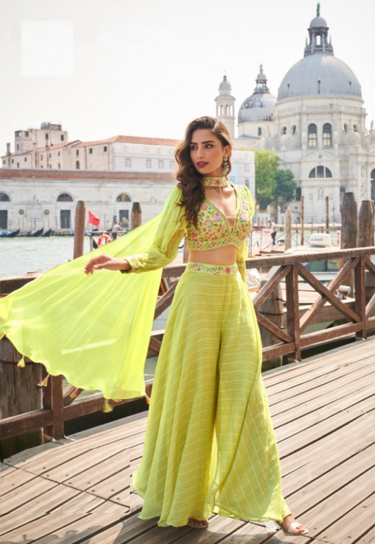 Women Yellow Real Chinon Silk Indo Western Outfit Dress