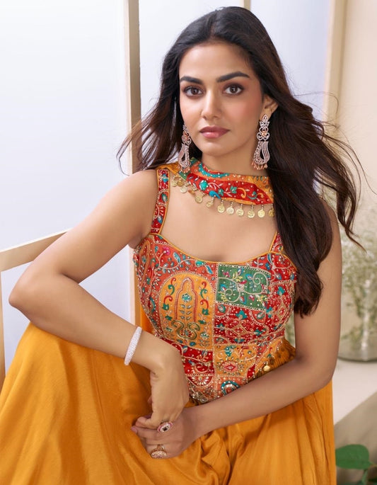Women Mustard Real Chinon Silk Indo Western Outfit Dress