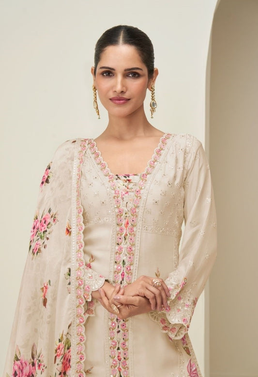 Women Beige Chinon Silk Palazzo Bottom Suit Set