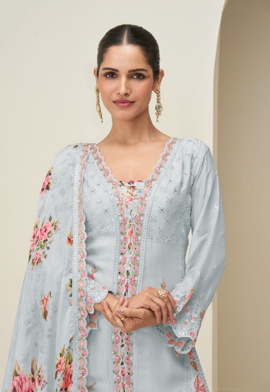 Women Light Blue Chinon Silk Palazzo Bottom Suit Set