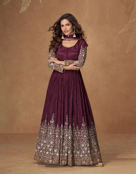 Gleaming Dark Purple Chinon Silk Floor Length Suit Set
