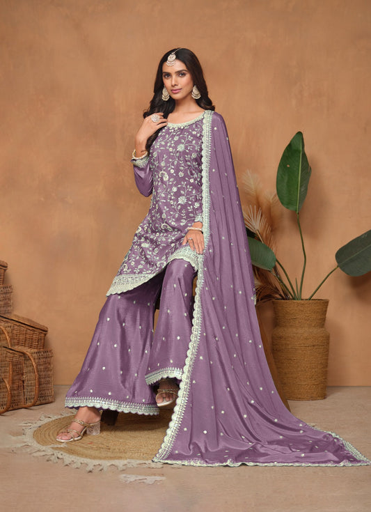 Trendy Purple Premium Fiber Chinnon Suit With Afghani Pant