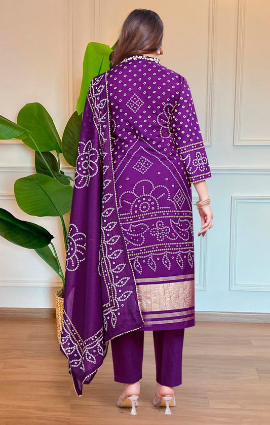 Women Purple Viscose Gajji Silk Bandhani Print Suit Set