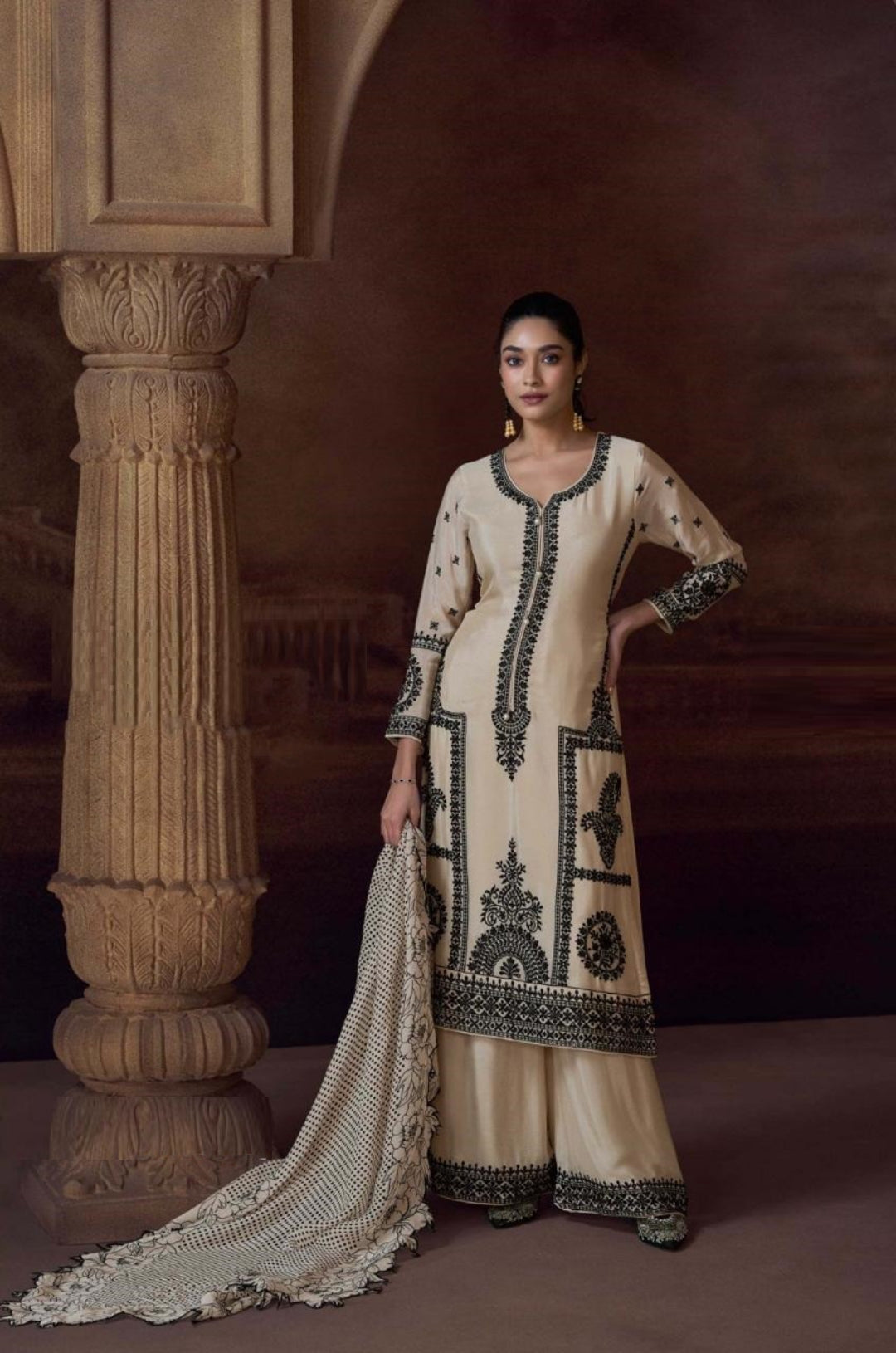 Alluring Cream Chinon Silk With Embroidery Work Pant Bottom Suit Set