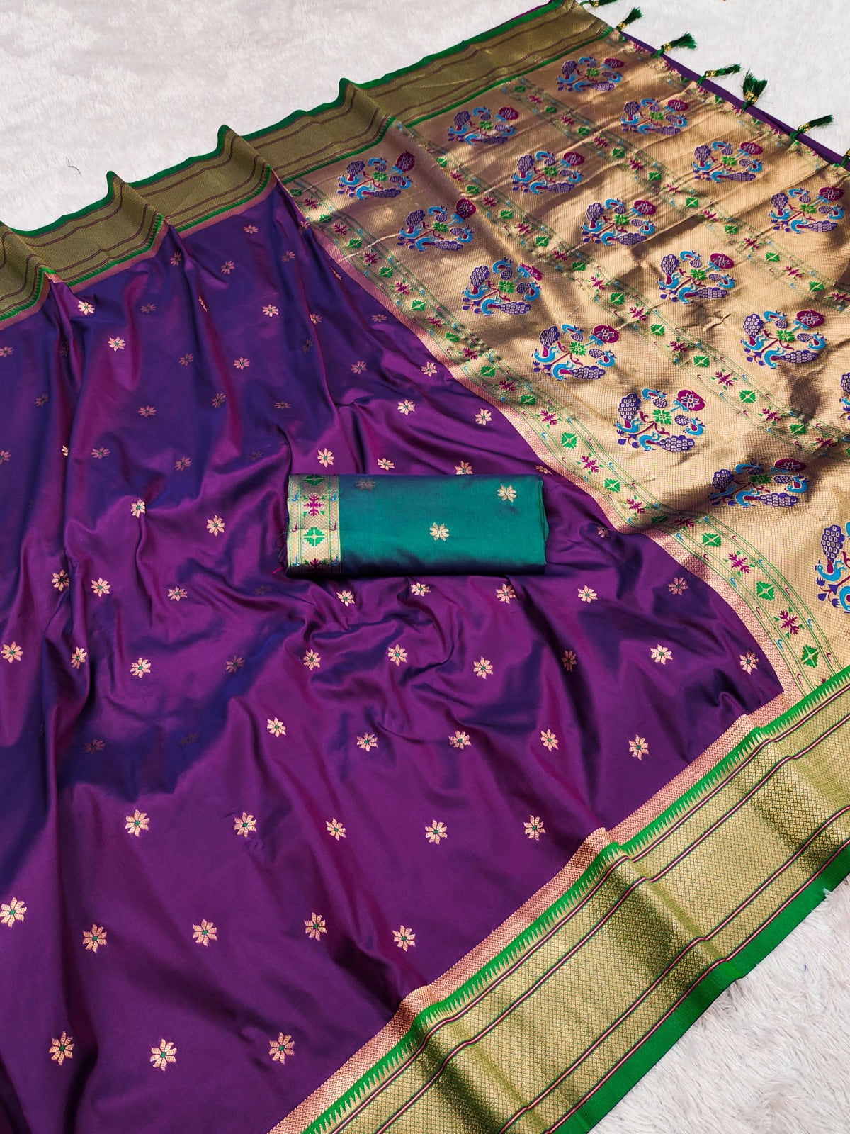 Soft Pethani silk saree with zari weawing design and Meenakari weawing Rich pallu with Kadiyal border Tessels attached at Pallu end