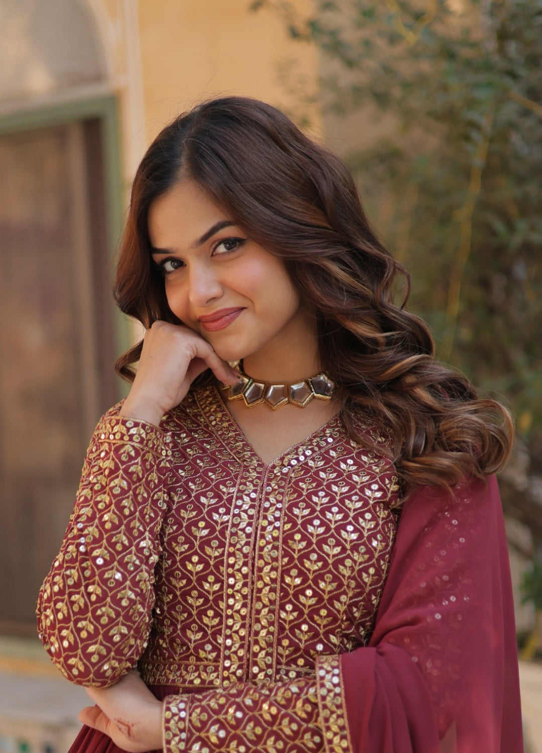 Charming Burgundy Georgette With Embroidered Work Front-Slit Salwar Suit Set