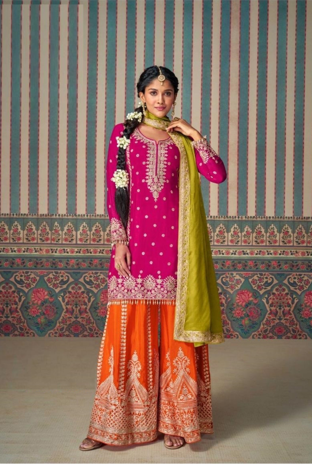 Exquisit Orange And Pink Chinon Silk With Embroidery Work Palazzo-Bottom Suit Set