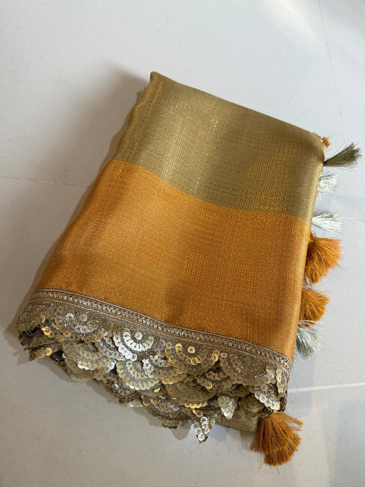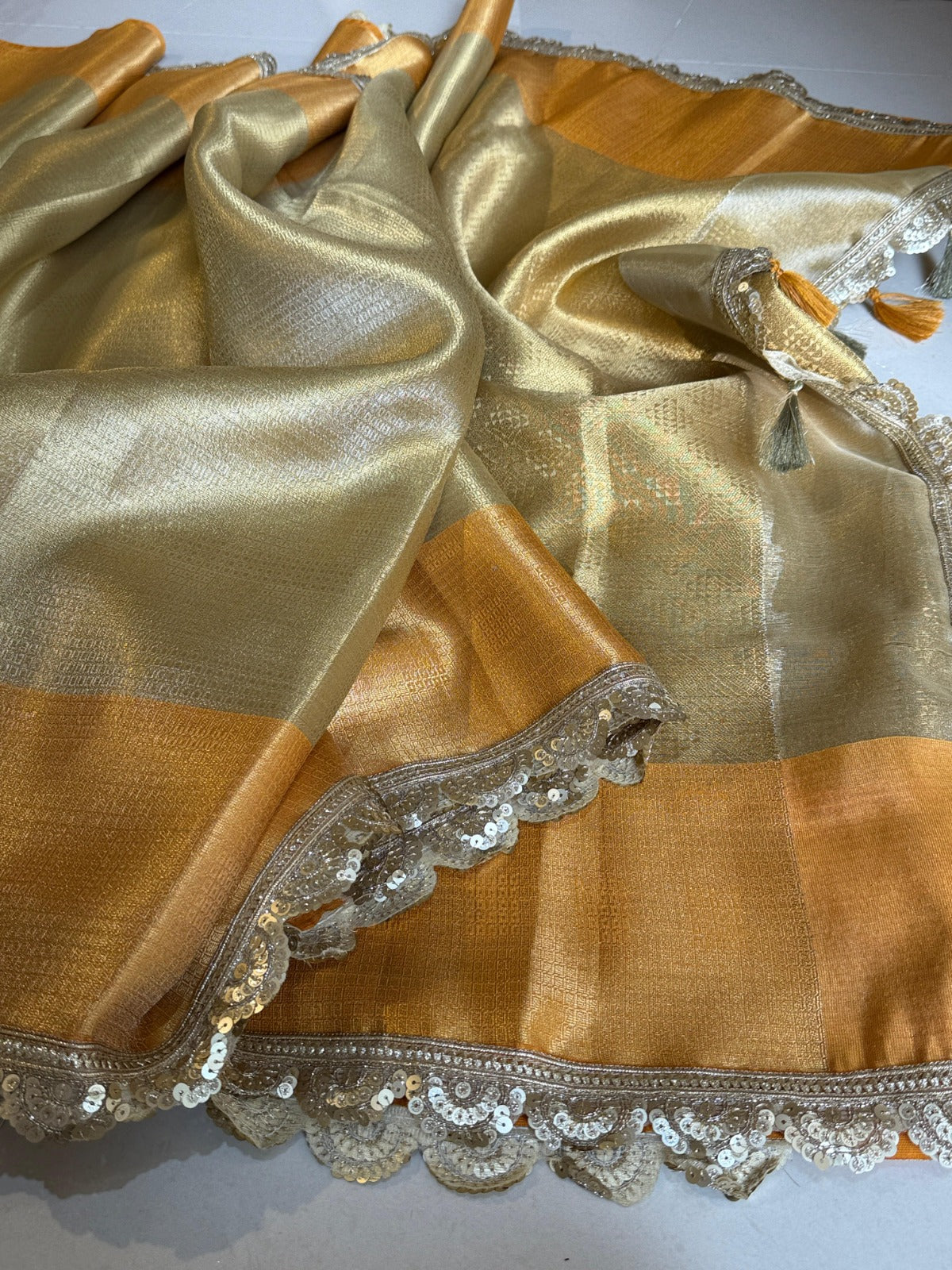 Gleaming Gold And Orange Banarasi Zari Tanchui Kanchipuram Soft Silk Saree