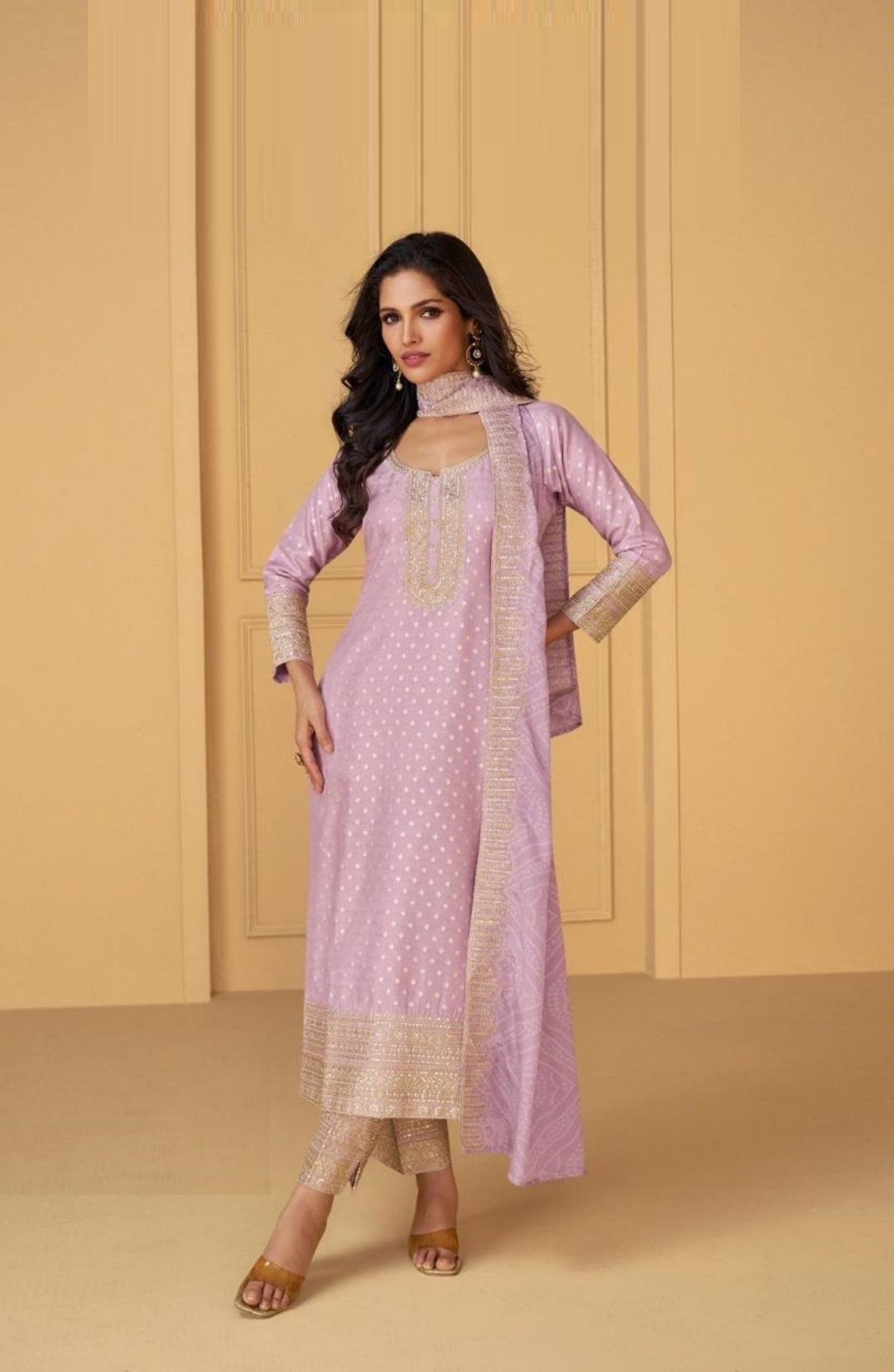 Elevate your wardrobe with our Gleaming Light Purple Viscose Jacquard Silk Suit Set. Crafted with high-quality materials, this suit set offers a luxurious and elegant look. The intricate jacquard design adds a touch of sophistication, making it perfect for any special occasion. Elevate your style game with this stunning suit set.