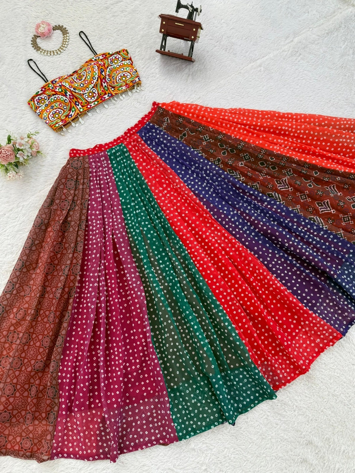 This radiant multicolor georgette lehenga set features vibrant digital prints that blend traditional motifs with contemporary style. Crafted from lightweight georgette, it offers a graceful drape and comfortable wear. The bold color palette and detailed patterns make it an ideal choice for festive occasions, combining artistic elegance with modern vibrancy.