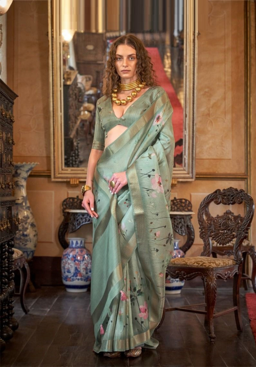 Experience the soft and luxurious feel of our Soft Weaving Sea Green Banarasi Floral Saree. Made with the finest fabrics and intricate floral designs, this saree is perfect for adding a touch of elegance to any occasion. Made to provide both comfort and style, it's the perfect addition to your wardrobe.