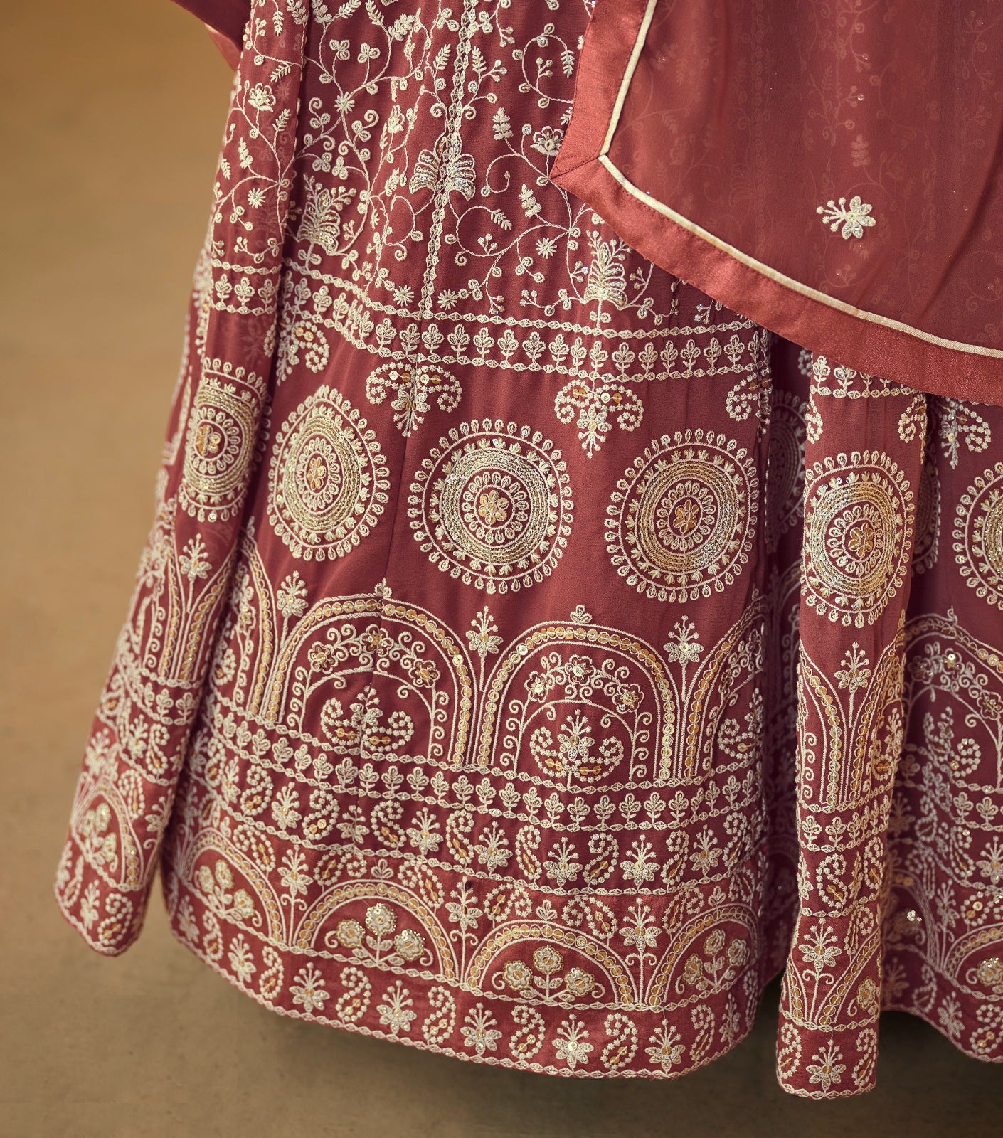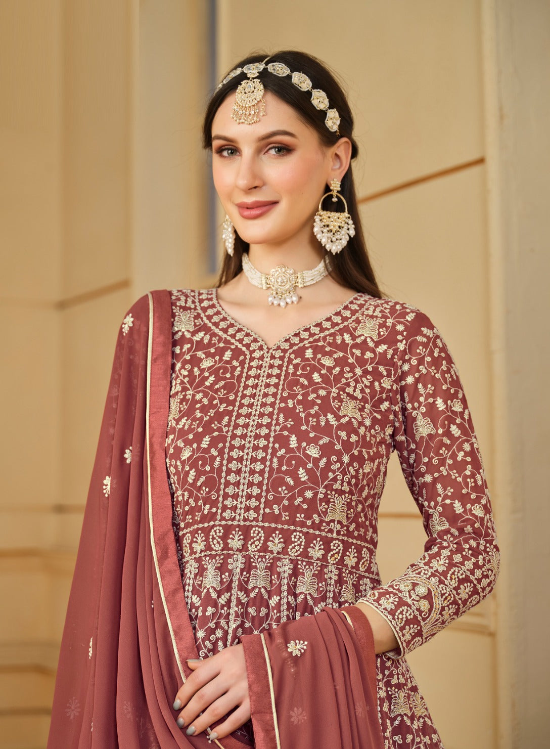 This statement-making rust georgette floor length suit set is a must-have for any formal occasion. The rust color adds a touch of elegance, while the georgette fabric offers a lightweight and flowy feel. Perfect for making a lasting impression with its stunning design and comfortable fit.