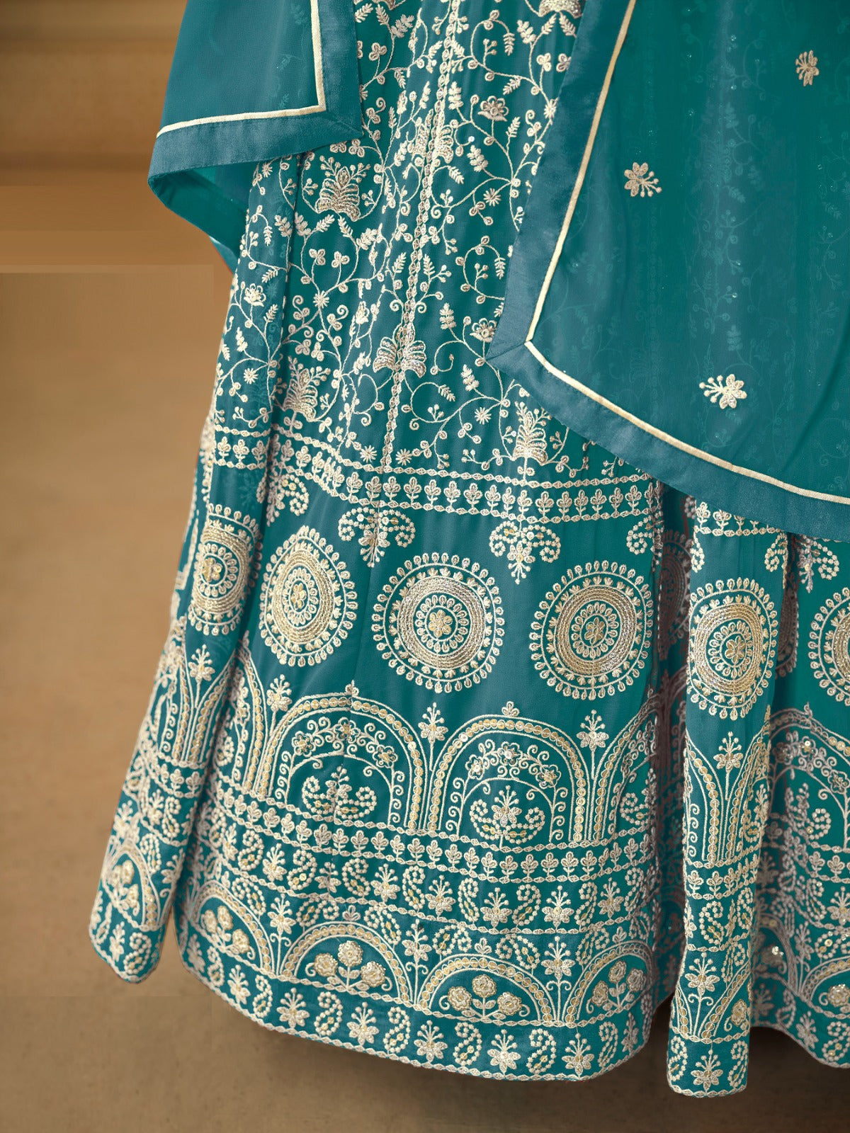 This sumptuous teal georgette floor length suit set offers a stylish and elegant look. The lightweight material adds comfort, while the flowy design flatters your figure. Perfect for any occasion, it's a must-have in your wardrobe.
