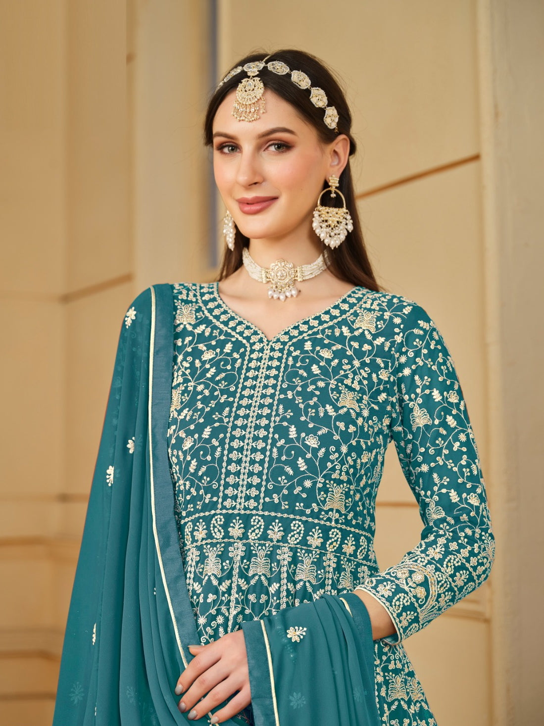 Sumptuous Teal Georgette Floor Length Suit Set