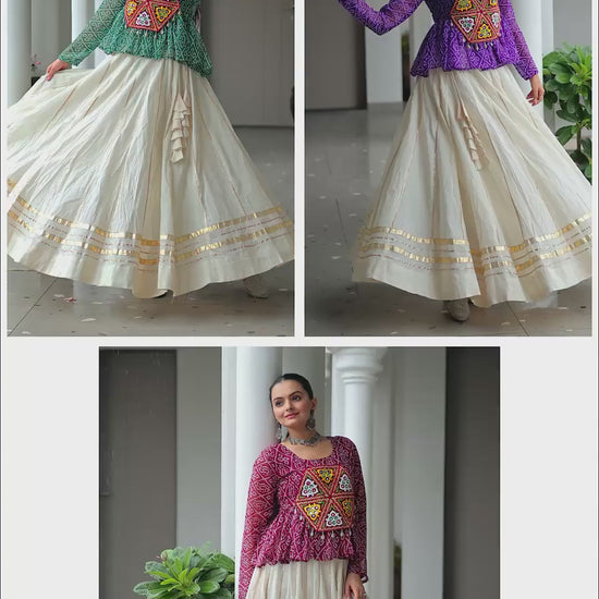 This trendy off-white and maroon cotton lehenga set features attractive gota patti lace work that exemplifies expert craftsmanship. Crafted from breathable cotton, it ensures comfort while offering a structured and elegant silhouette. The classic off-white backdrop contrasted with rich maroon accents creates a contemporary yet traditional look, making it ideal for festive occasions and celebrations.