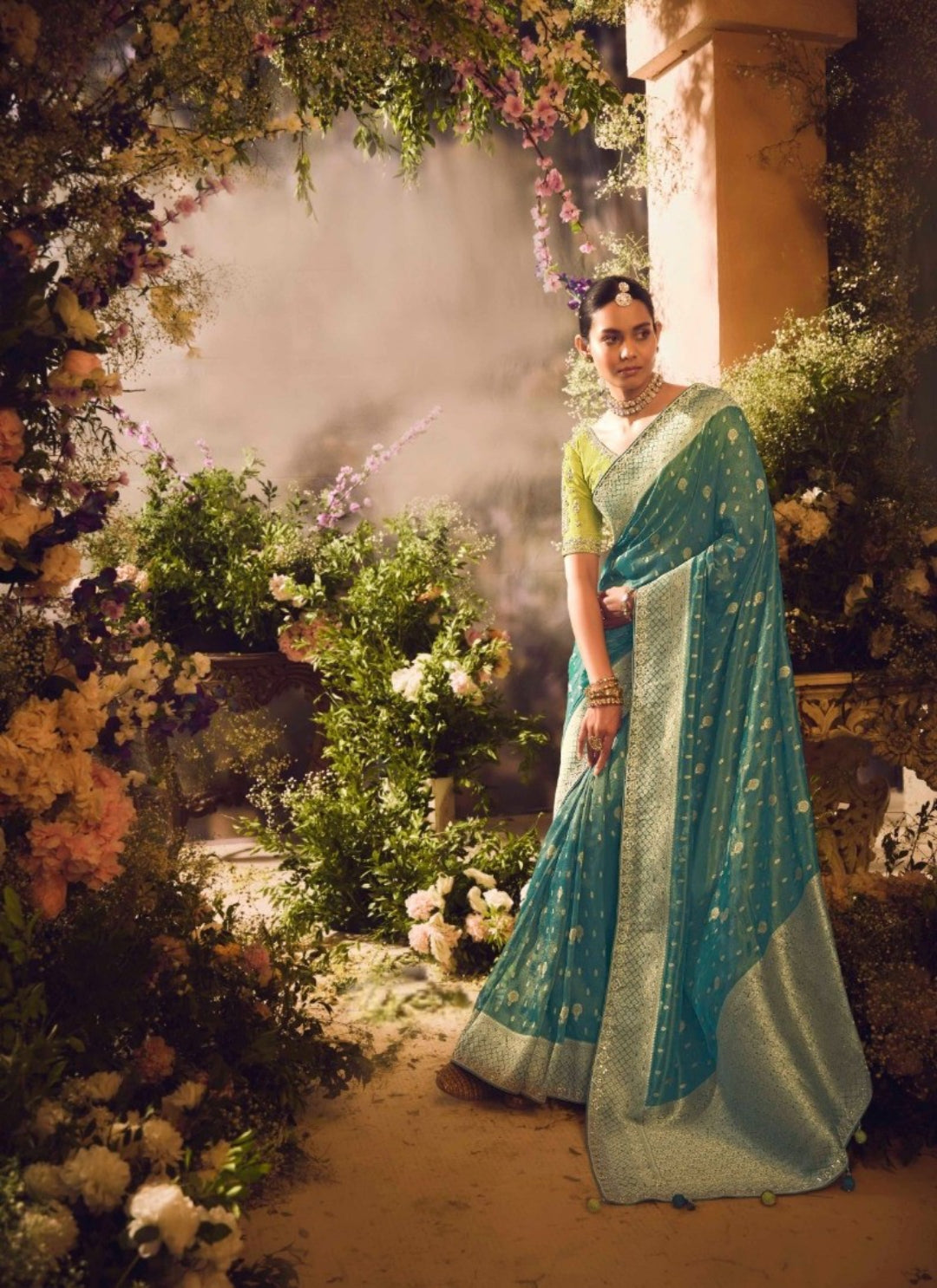 Trendy Teal Pista Green Banarasi Embroidery Saree