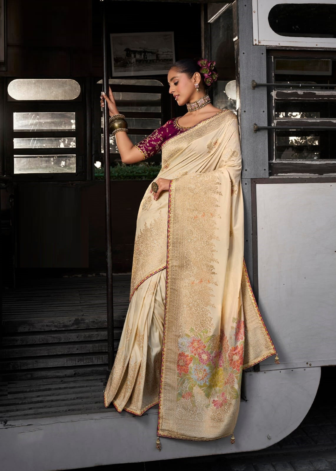 Women Beige And Burgundy Viscose Silk Embroidery Saree