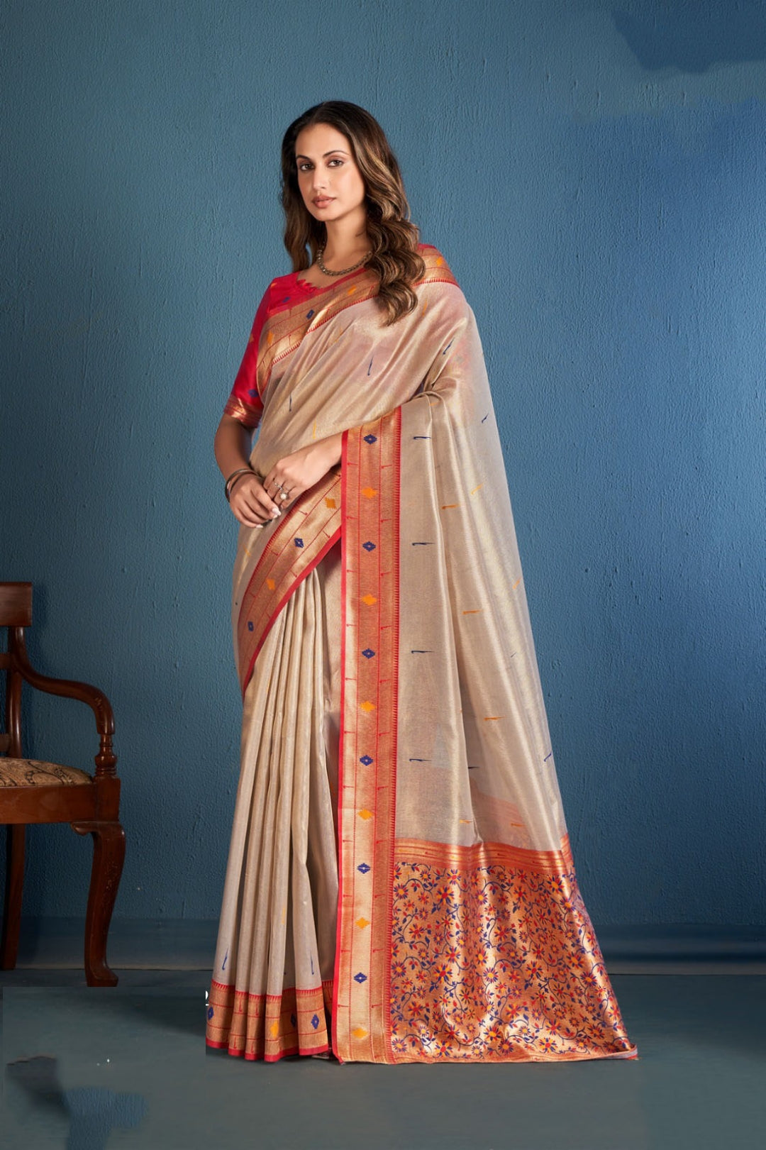 Women Beige And Red Soft Tissue Paithani Silk Saree