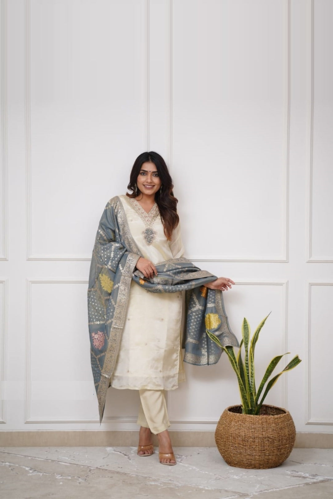 Discover the perfect combination of elegance and comfort with our Women Beige Viscose Chanderi Suit Set. Made with high-quality viscose chanderi fabric, this suit set offers a luxurious and lightweight feel. Its sophisticated beige color adds a touch of femininity, making it a must-have for any occasion.