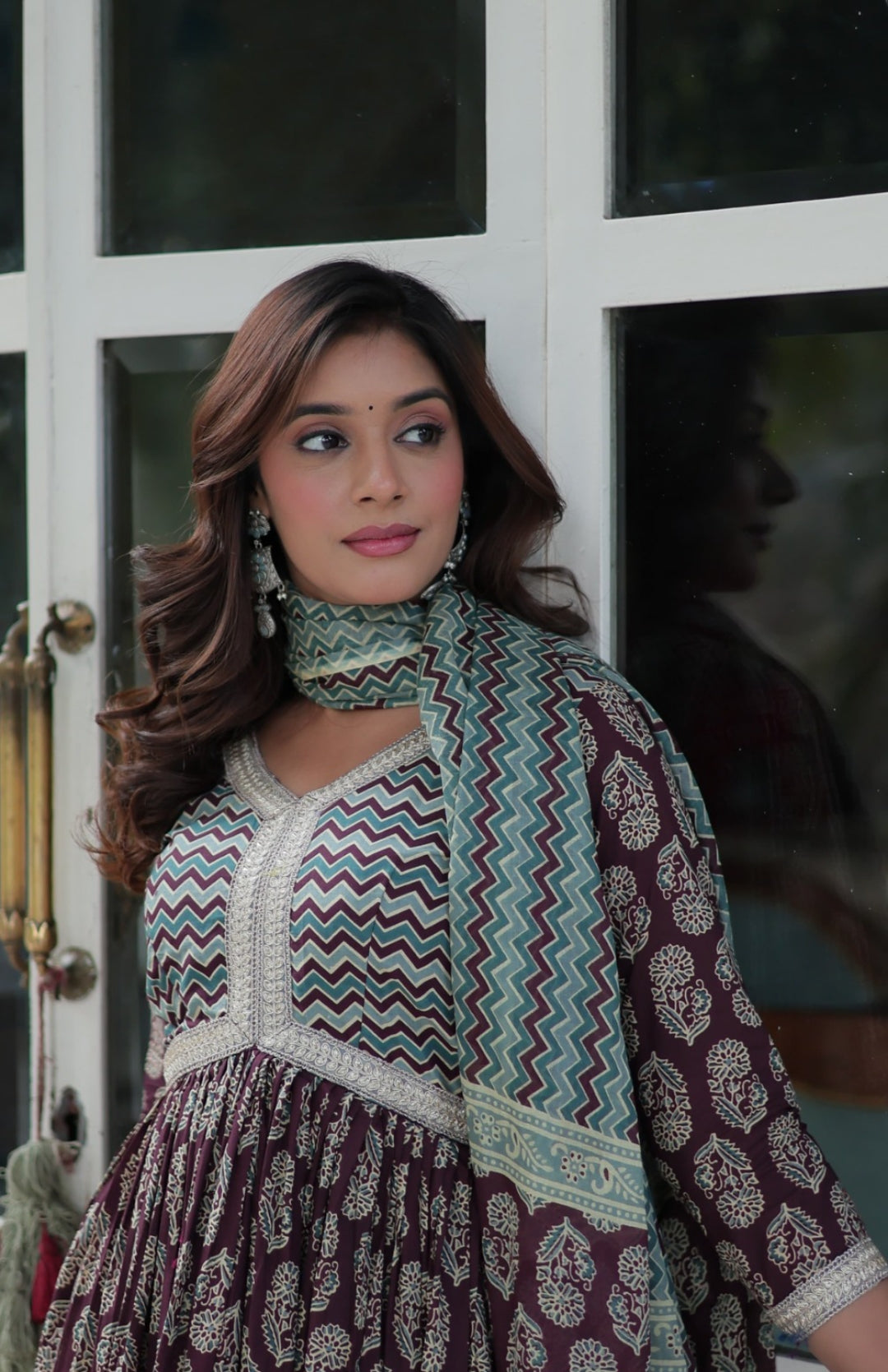 This burgundy cotton anarkali suit set is perfect for any occasion. Made with high-quality fabric, it offers both style and comfort. The elegant design features intricate detailing and a flattering fit, making it a must-have addition to any wardrobe. Upgrade your attire with this beautiful and versatile outfit.
