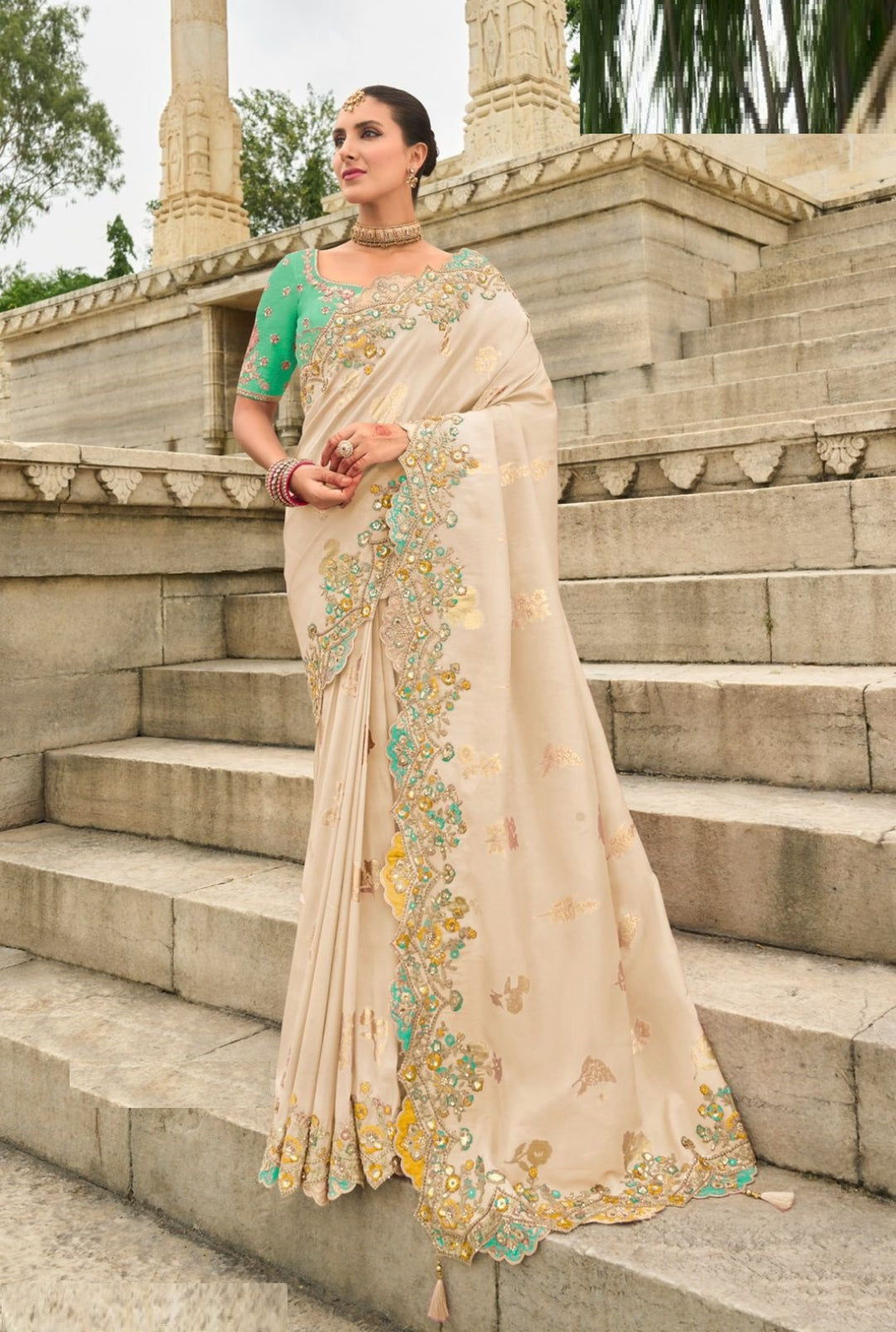 Women Light Beige Silk With Embroidery Sequins Work Bridal Saree