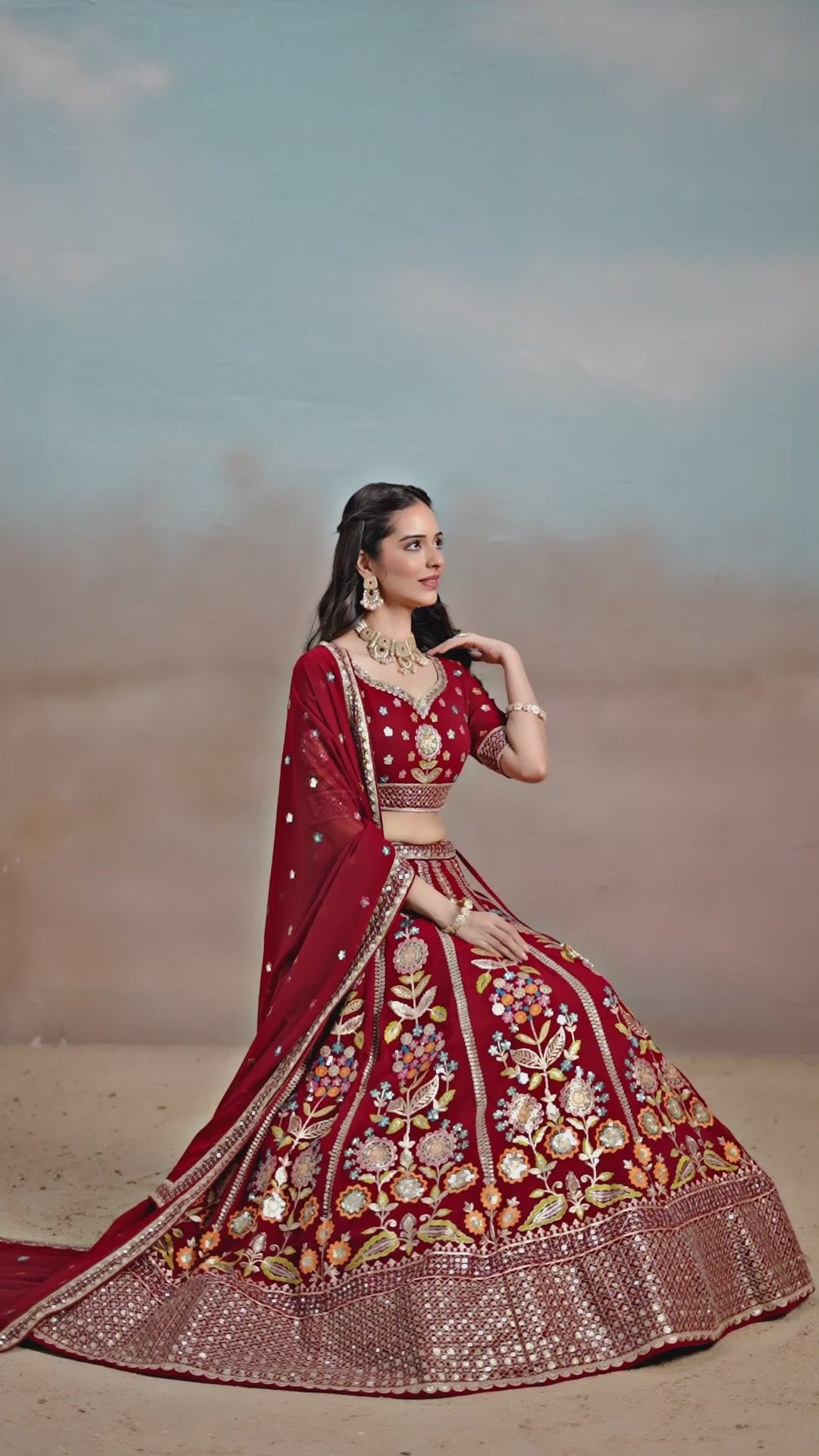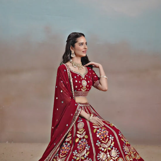 Radiate timeless beauty in this luxurious maroon georgette lehenga, adorned with sparkling sequins, rich zari embroidery, and intricate dori work. The glimmering embellishments create a mesmerizing effect, making it perfect for weddings, receptions, and festive occasions. Tailored from soft, flowing georgette fabric that ensures comfortable wear throughout the day, this lehenga showcases exceptional embroidery artistry. The deep maroon hue exudes sophistication and elegance, while the detailed embellishments add a touch of grandeur, making it an essential choice for celebrations where you want to stand out with grace and style.