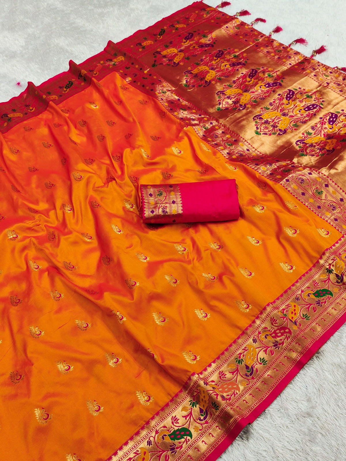 Soft Pethani Silk Saree With Zari Weawing Meenakari Design And Meenakari Weawing Rich Pallu With Meenakari Weawing Peacock Border & Tessels Attached At Pallu End.