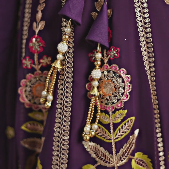 Step into elegance with this stunning purple georgette lehenga, featuring lavish sequin embellishments, golden zari detailing, and ornate dori work throughout. The shimmering accents create a captivating sparkle perfect for weddings, celebrations, and special occasions. Made from lightweight georgette fabric that drapes beautifully and moves gracefully, this lehenga ensures comfort without compromising on style. The meticulous embroidery showcases traditional artistry, while the rich purple tone adds a regal touch, making it an excellent choice for those who desire a sophisticated ethnic look with contemporary appeal and undeniable glamour.