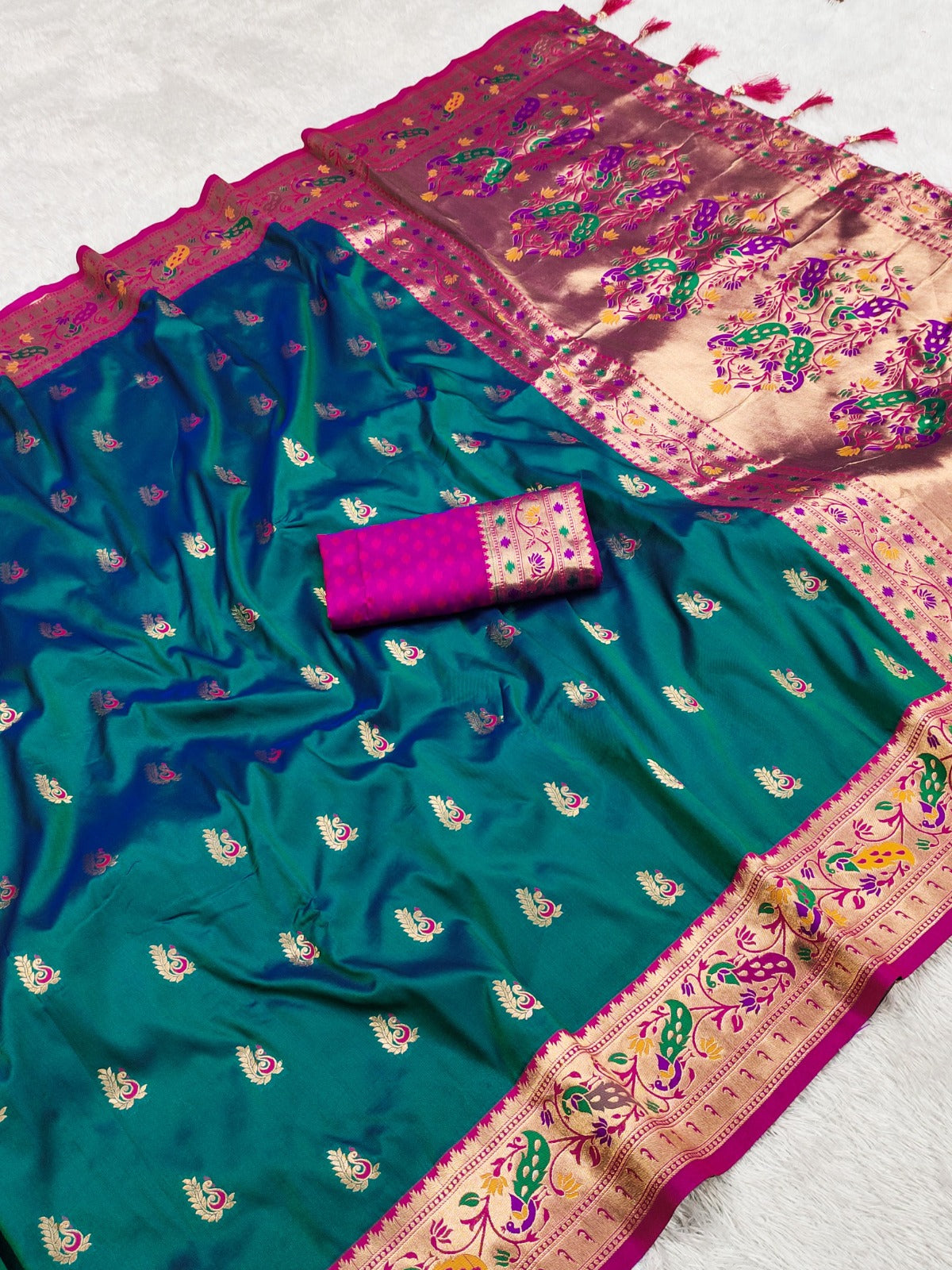 Soft Pethani Silk Saree With Zari Weawing Meenakari Design And Meenakari Weawing Rich Pallu With Meenakari Weawing Peacock Border & Tessels Attached At Pallu End.