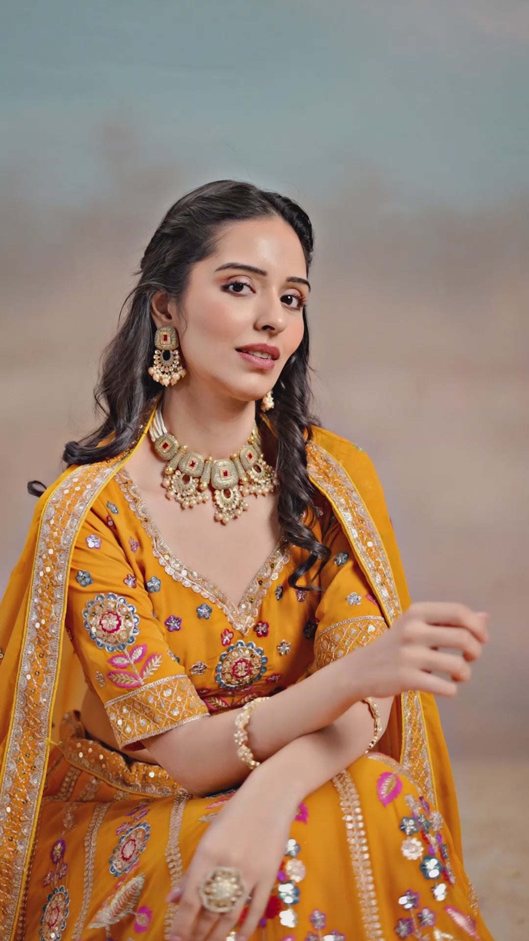 Shine bright in this radiant yellow georgette lehenga, adorned with sparkling sequins, lustrous zari embroidery, and intricate dori detailing. The glittering embellishments create a luminous effect that radiates warmth and joy, perfect for weddings, festivals, and celebratory events. Constructed from breathable georgette fabric, this lehenga offers graceful movement and all-day comfort. The skilled embroidery work reflects traditional craftsmanship with a contemporary touch, making it an ideal selection for those seeking a vibrant ethnic ensemble that combines timeless elegance with modern sophistication and eye-catching brilliance.